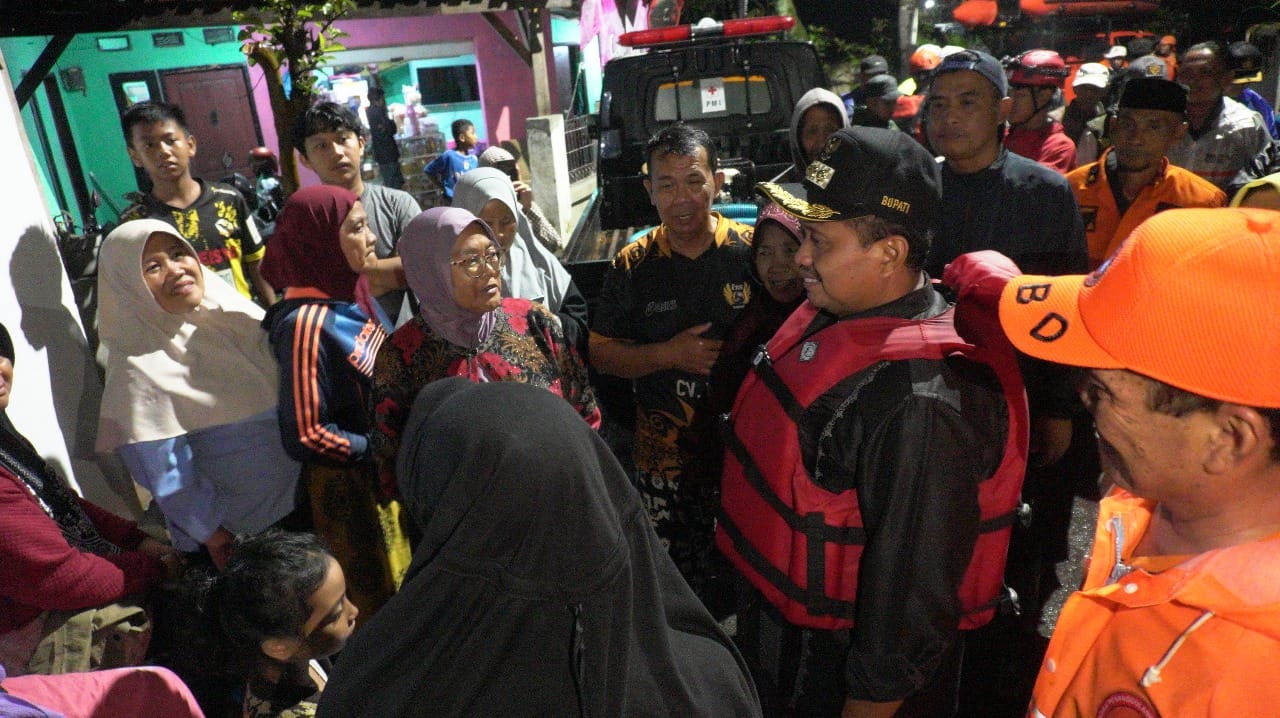 Bupati menyusuri rumah-rumah warga Desa Cihanjuang memastikan keselamatan jiwanya yang terdampak banjir dan membujuk agar warga yang bertahan di rumahnya untuk mau dievakuasi tim dari BPBD Kabupaten Sumedang, Basarnas Bandung dan Forkopimcam Cimanggung.