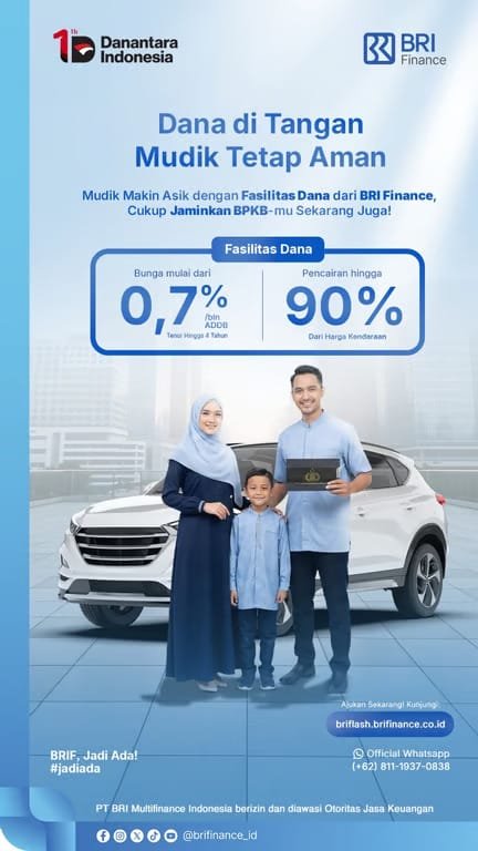 Memahami kondisi tersebut, PT BRI Multifinance Indonesia (“BRI Finance”) menghadirkan program fasilitas dana tunai dengan jaminan BPKB kendaraan. Melalui program ini, masyarakat dapat menikmati bunga mulai dari 0,7% per bulan (ADDB) dengan tenor hingga 4 tahun, serta pencairan dana hingga 90% dari harga kendaraan. Skema ini dirancang untuk memberikan fleksibilitas arus kas, tanpa mengganggu rencana perjalanan mudik.